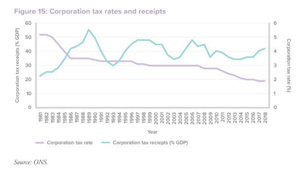 Despite a gradual decline in Corporation Tax rate from over 50% in 1981, Corporation Tax receipts as a percentage of GDP have remained well above 1981 levels and have increased since 2013 despite cuts to Corporation Tax.