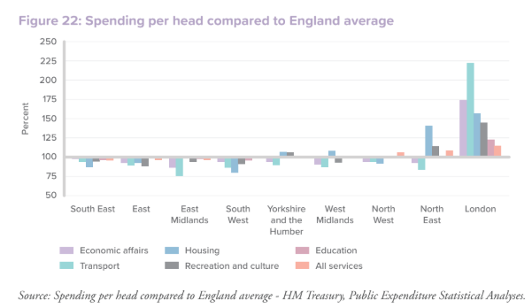 Government spending is heavily weighted towards London and away from areas such as the Midlands, South West and the North West.